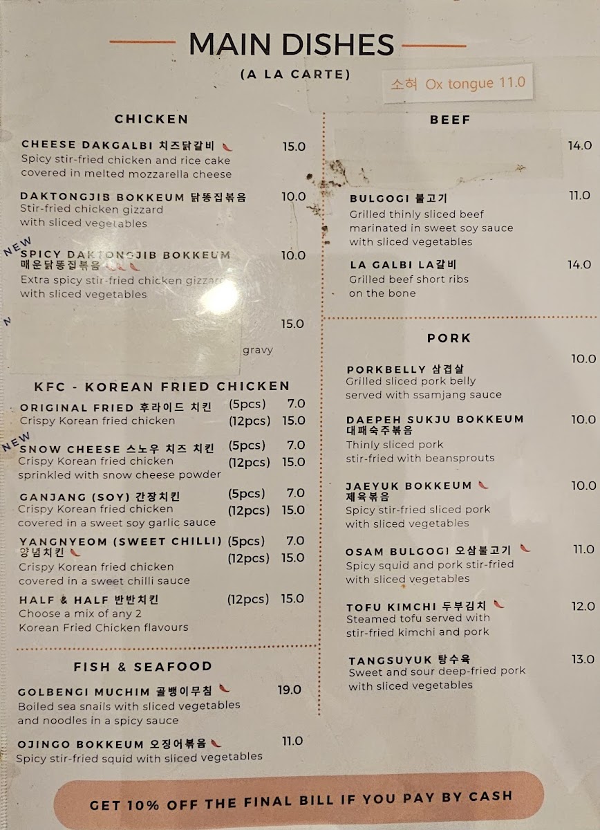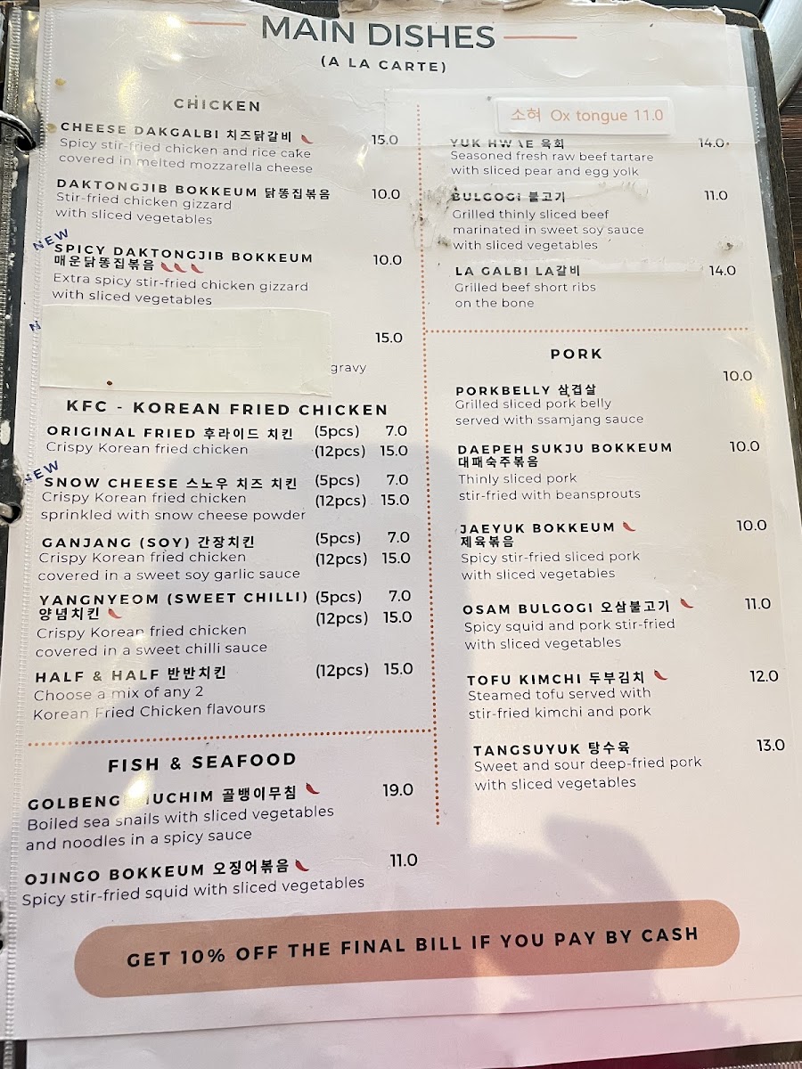 The menu highlights include notable Korean specialties such as Korean fried chicken in different styles (including a 50/50 mix), seafood pancake, dolsot bibimbap (a stone pot mixed rice), cheese dak-galbi (spicy stir-fried chicken with cheese), chicken wings, beef tartar, beef soup, and naengmyeon (cold noodle dish).